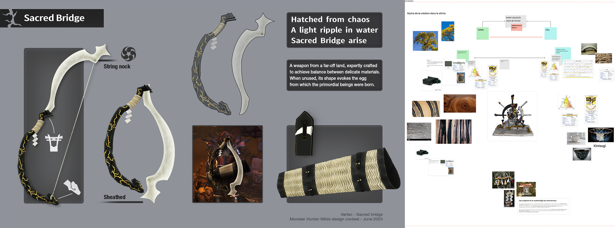 Carte blanche sur les possibles, des règles sur la modalité de rendu et une deadline de 3 semaines afin de soumettre notre idée. Nous sommes arrivés à un concept d’arc s’inspirant de la mythologie Shinto et de la naissance du monde et de l’oeuf cosmique.