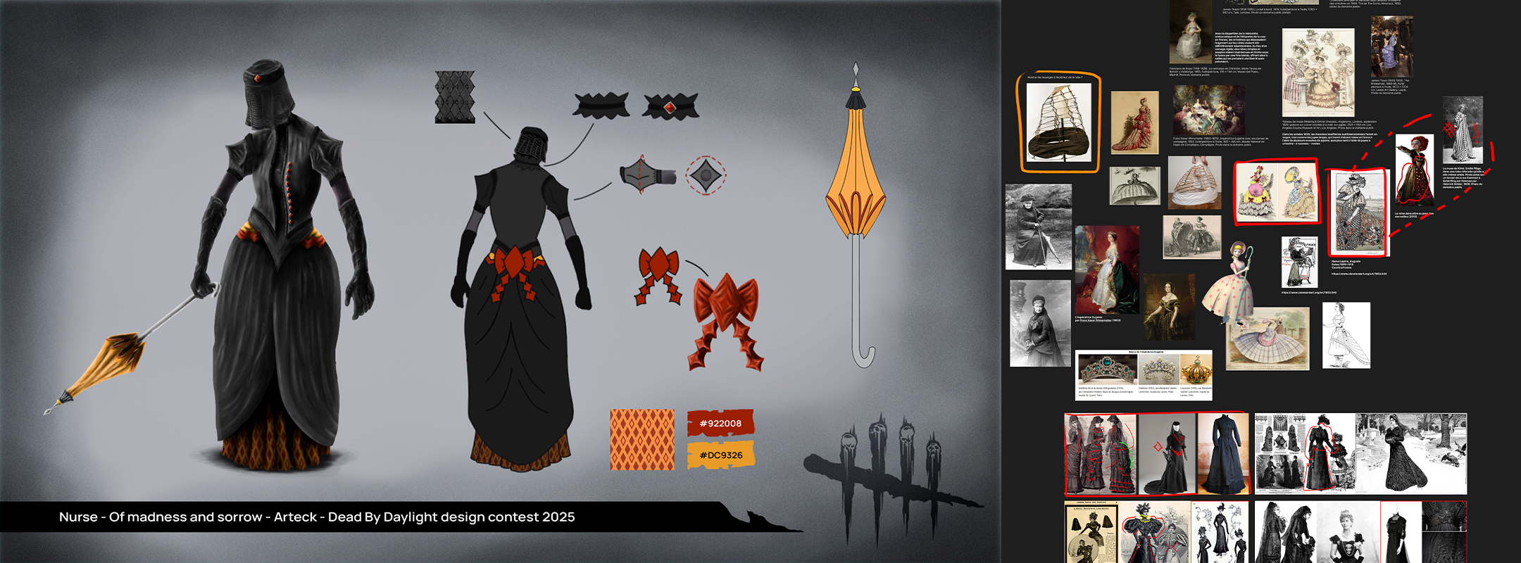 Après une phase de moodboards individuels et de recherches tout azimuts, nous avons mis en commun nos explorations pour faire émerger un concept : un mélange entre le veuvage, lié à l’histoire du personnage choisi, et la folie au travers de la mode du 19e siècle.