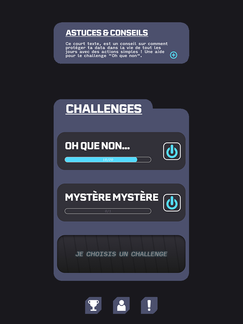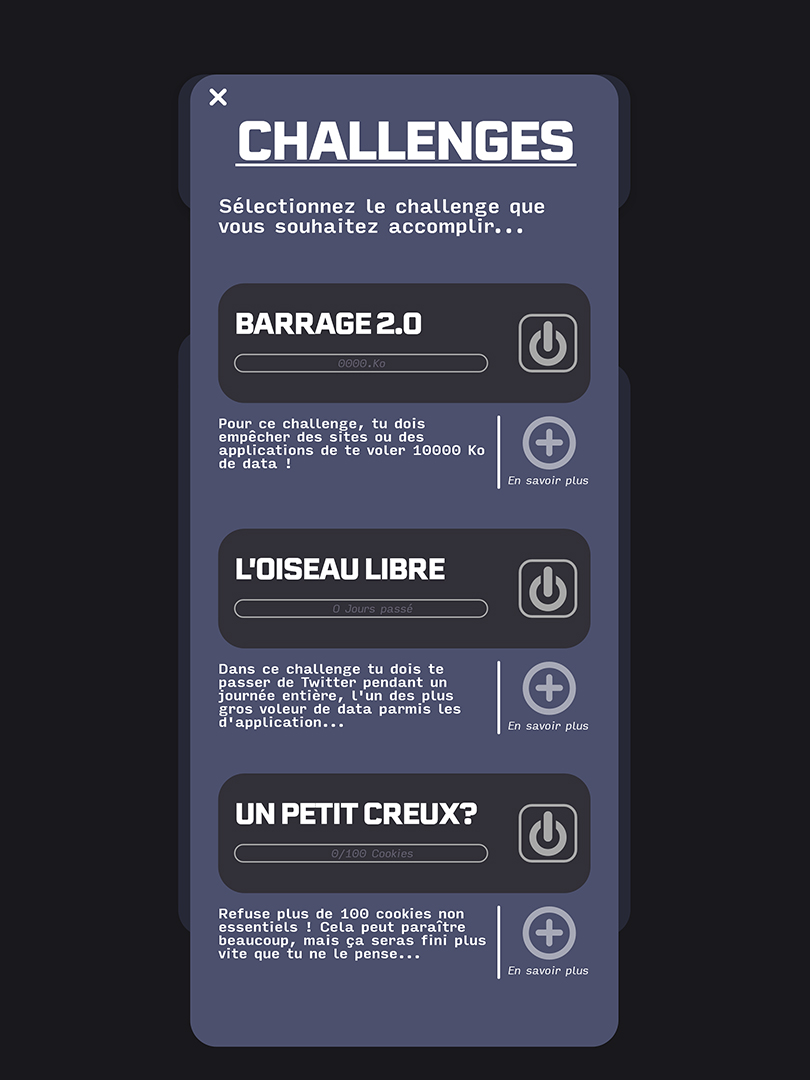 Projet de fin d’études bac +3, il se concentre sur l’utilisation et la sensibilisation d’une cible jeune à la data et à des enjeux de plus en plus pressants dans nos sociétés numériques. Je me suis greffé non officiellement à la campagne de l’UFC Que Choisir "Je ne suis pas une data”, du constat que cette dernière ne ciblait pas suffisamment les jeunes, futurs usagers majoritaires des outils numériques et acteurs de la société de demain. Ce fut l’occasion de me documenter sur la data et ses enjeux, ainsi que de mieux appréhender l'ensemble d’un projet design.