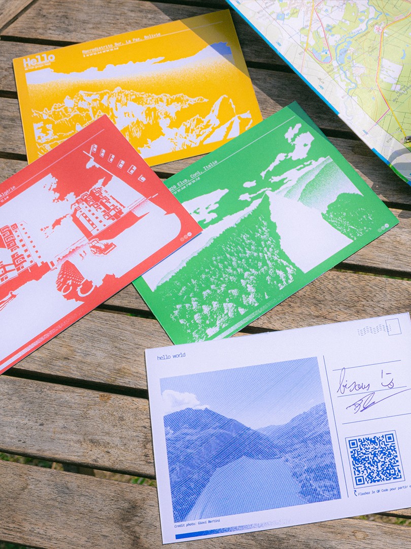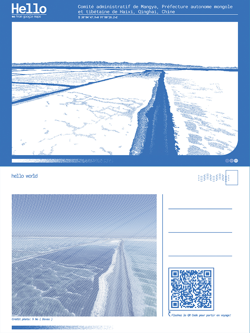Projet personnel mélangeant art numérique, web et graphisme, il y est question de cartes postales réalisées à partir de vues à 360° trouvées via Google Maps. L’objectif est d’inciter au voyage, à la découverte et de sensibiliser sur les paysages qui nous entourent. Il s’agit d’une série de 12 cartes postales réparties en 4 thèmes. Le bleu pour l’eau, le vert pour le boisé ou fortement végétalisé, le jaune pour le rocailleux, et le rouge pour les zones humaines.