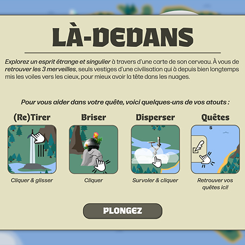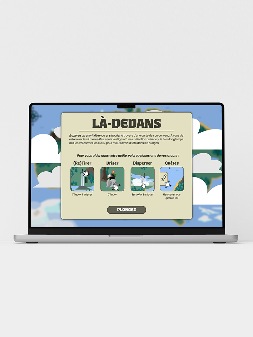 Projet scolaire explorant l’introspection de l’auteur par l’intermédiaire d’une expérience interactive gamifié. Inspiré de ma passion pour la nature, l’exploration et les jeux d’aventure, j’ai choisi de plonger l’utilisateur dans une carte où il doit trouver trois ruines afin d’en apprendre plus sur l'environnement où il se trouve.