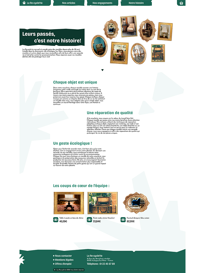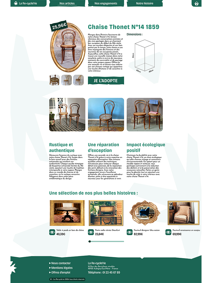Pour appuyer et inspirer l’authenticité de la démarche de cette recyclerie, l’interface et l’ensemble des éléments graphiques se devaient d’être dans une démarche sobre et hors des normes rectilignes que l’on trouve majoritairement dans une interface web. En plus des cadres où les photos de meubles sont incrustées, créant déjà des formes particulières dans l’interface, les différents blocs et fonds de couleurs arborent des formes se rapprochant d’une sorte de travail manuel de la matière, avec des angles et des imperfections. La mise en page en elle-même reste volontairement aérée et propose les informations essentielles sans appel inutile pour garder un calme dans la compréhension de l’interface et de l’histoire des objets. En somme, l’ensemble de la direction artistique concourt à l’authenticité de la démarche de la recyclerie.